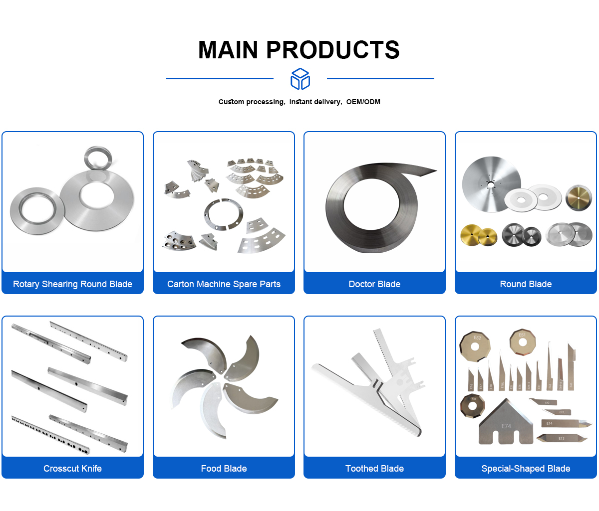 Productos principales:Cuchilla Doctor, cuchilla redonda, cuchilla de máquina de corte, cuchilla dentada, cuchilla de forma especial